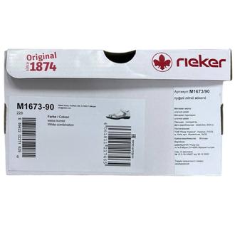 Босоножки Rieker арт. M1673-90. Летний сезон. Фасон - Босоножки. Застёжка - липучка. Каблук - каблук низкий. Материал - экокожа. Материал подкладки - искусственная кожа. Вид стельки - кожаная стелька. Высота каблука - 2,8 см. Толщина подошвы - 1 см.